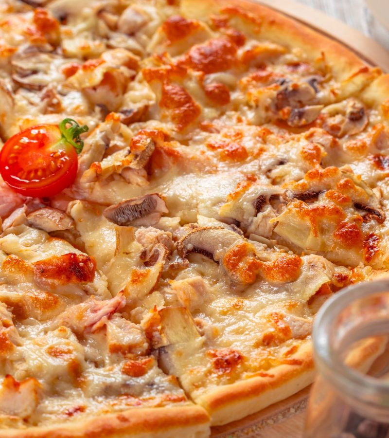 - Armado de pizza salada con pollo en BBQ de guayaba, queso stracciatella y vegetales.