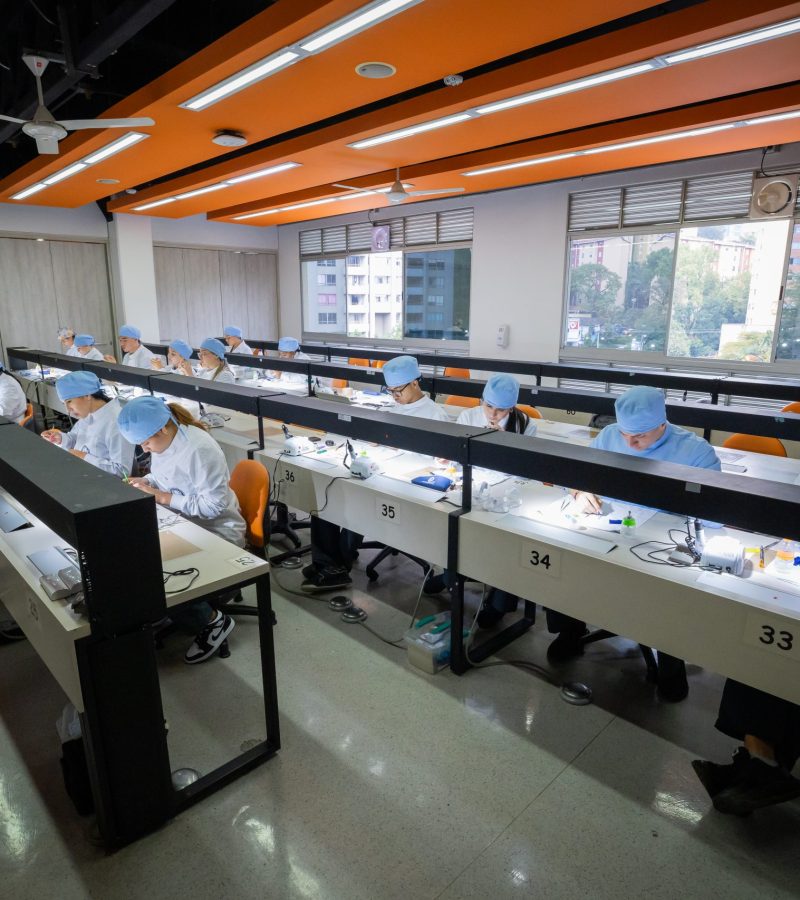 Este salón contiene mesas adecuadas con tomas de aire a presión para jeringas de aire y piezas de motor. Son 100 posiciones de trabajo. También, contamos con un laboratorio para trabajar yeso que cuenta con dos pozuelos y dos máquinas recortadoras. El laboratorio presta servicios principalmente a los programas de la Facultad de Odontología.