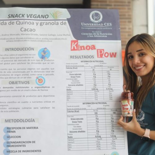 Esta bebida está diseñada para deportistas, sin embargo, la puede consumir cualquier persona que opte por una opción de snack que sea vegano. En el mercado no se encuentran muchos snacks que sean veganos para la población que quiere disfrutar de esta opción”, Paula Andrea Tamayo Hoyos, estudiante de séptimo semestre del pregrado de Nutrición y Dietética de la Universidad CES.