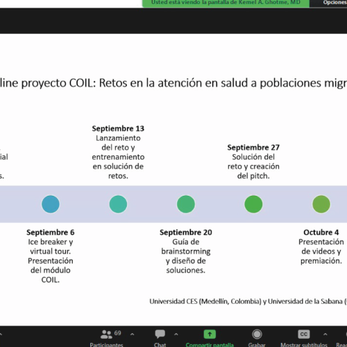 El proyecto Retos en la atención en salud a poblaciones migrantes se desarrolló bajo la metodología COIL (Aprendizaje cooperativo internacional en línea, por sus siglas en inglés) entre agosto y noviembre de 2022, bajo la coordinación de los docentes Luisa Fernanda Velásquez Villa de la Universidad CES y Kemel A. Ghotme de la UniSabana, elegido como proyecto meritorio.